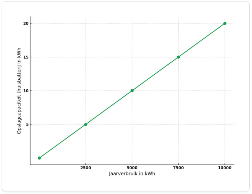 De eerste 5 kWh opslagcapaciteit van een thuisbatterij is het meest waardevol, omdat deze vrijwel constant volledig benut wordt. Het klinkt tegenstrijdig, maar een kleinere capaciteit is vaak efficiënter zijn dan een te grote. Een goede vuistregel is om per 2500-3000 kWh jaarverbruik ongeveer 5 kWh batterijcapaciteit te installeren. Dit zorgt ervoor dat je overdag de batterij oplaadt met zonne-energie en 's avonds genoeg stroom hebt om je apparaten te voeden.